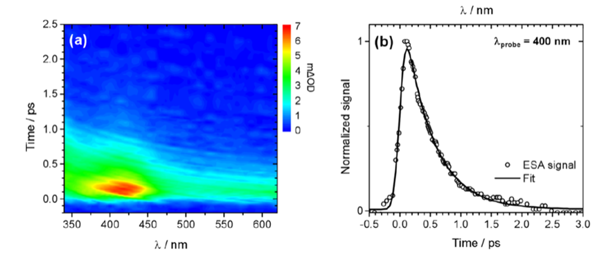 圖 5: (a) Waterfall plot of TAS spectra of Ade[-H] in D-2O excited with a 266 nm pump laser as a function of delay time, and (b) normalized decay kinetics at 400nm.[2]